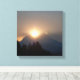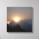 A photograph of the morning sun rising above the crest of Mount Rainier's mountain top.
