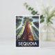 Capture the awe-inspiring scale of Sequoia National Park, California, with this dramatic retro travel postcard. The design showcases the colossal height of the ancient Giant Sequoia trees towering toward the sky, minimizing the hiker beneath to emphasize their immense size. This artwork perfectly conveys the grandeur and majesty of this California natural landmark, making it an excellent piece for nature lovers and collectors of US National Park posters.