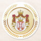 The national coat of arms of Serbia, is infused into a faux gold rimmed circle, and this circle is set inside a faux gold laurel wreath.