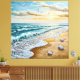 A tranquil beach scene showcasing gentle waves lapping against the sandy shore under a colorful sky, featuring seashells and seagulls flying overhead.