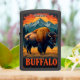This artwork captures a serene moment with a bison in a detailed, engraved-style landscape. The scene features mountains, trees, and glowing foliage, all rendered with a tooled leather texture. A large moon or sun hangs in the sky, adding to the tranquil and rustic feel of the piece.