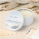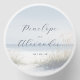 This wedding candle features a serene beach scene with soft sandy tones and gentle waves, creating a tranquil atmosphere. The minimalist design includes tall grasses framing the elegant script typography that highlights names and a date in a modern sans-serif font. The muted blues of the sky and ocean complement the light beige hues of the sand, evoking a dreamy seaside vibe. Perfect for adding a touch of romance to your special day, this candle combines natural scenery with sophisticated style.