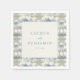 These wedding napkins feature a modern, elegant design with a central rectangular frame bordered by a subtle blue-gray double line. The surrounding geometric pattern includes soft blues, grays, and warm beige tones arranged in a staggered layout that adds texture and movement. The typography is clean and minimalistic, using an uppercase serif font for the names and a lowercase "and" to create a refined contrast. Perfect for formal occasions, these napkins convey a serene and sophisticated atmosphere, making them ideal for weddings or special celebrations.
