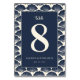 This elegant wedding table card features a sophisticated navy blue background framed by intricate seashell patterns, creating a serene and nautical-inspired theme. The design showcases a large, centered number "8" in crisp white, with the word "table" elegantly scripted above it. Customizable placeholders for names and dates are presented in a clean sans-serif font, adding a modern touch to the classic layout. The harmonious color palette and balanced composition evoke feelings of tranquility and sophistication, making it perfect for formal beach or ocean-themed weddings.