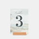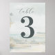 This wedding table card features a serene beach scene with soft watercolor textures, creating an impressionistic coastal landscape. The design centers around a bold numeral "3" in dark gray, complemented by elegant cursive script for the word "table." Muted blues, grays, and whites dominate the palette, evoking a calming and inviting atmosphere. Customizable text allows for personalization, making it perfect for adding a touch of sophistication to your event. The abstract representation style captures the essence of a tranquil seaside setting, ideal for weddings or romantic celebrations.