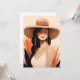 Dive into tranquility with our Serene Boho Portrait Card, depicting a woman with closed eyes, a wide-brimmed hat, and long earrings. Abstract tropical leaves in warm tones frame her peaceful expression, embodying boho calm.