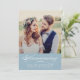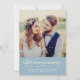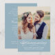 Set a soft and serene tone as you announce your marriage and invite loved ones to your wedding reception with this dusty blue calligraphy photo invitation. A muted blue banner features "Announcing" in elegant white script with names, date, and location. The back includes full reception details with venue, time, and RSVP contact information. Replace the photo and customize all text.