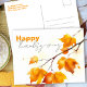 Enhancing the seasonal charm are delicately illustrated maple leaves in vibrant shades of orange and yellow. These leaves are attached to graceful branches that arc across the card, creating a natural frame for the text and capturing the serene beauty of autumn.