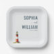 This wedding plate features a minimalist design with a clean white background, showcasing the names "SOPHIA and WILLIAM" in bold sans-serif typography paired with elegant cursive for "and." A charming lighthouse illustration adds a nautical touch to the composition. The color palette includes soft grays, vibrant reds, whites, and muted greens, creating a serene and sophisticated mood perfect for celebrating your special day.