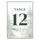 This wedding table card features a serene forest scene with tall pine trees in muted greens and grays, creating an ethereal atmosphere. The design showcases a bold number "12" at the center, surrounded by ample negative space for clarity. Customizable text fields allow for personalization with names and dates, while the typography combines elegant serif and clean sans-serif fonts to enhance readability and style. Perfect for weddings or formal gatherings, this card exudes tranquility and nature-inspired beauty, making it an ideal addition to any event setting.