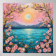 In the foreground, blossoming cherry trees with delicate pink flowers frame the image, their branches curling gracefully. The water below mirrors the colors of the sky, reflecting the tranquil mood, while golden accents, possibly depicting sunlight, add a touch of warmth and brightness. Overall, the image evokes a sense of peace and natural beauty.