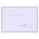 This wedding place card features a minimalist design with a light lavender background, creating an elegant and serene atmosphere. The layout includes a centered horizontal line at the top and the word "table" written in smooth, cursive script towards the bottom right, accompanied by a short line extending to the right. The clean lines and subtle contrast between the soft background and dark text emphasize simplicity and sophistication, making it perfect for modern weddings that appreciate understated beauty. The overall mood is calm and contemporary, ideal for setting a refined tone at your special event.