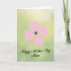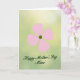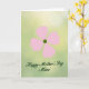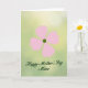 The front design shows a calm floral illustration that feels like a gentle hug for someone you care about ❤️. Near the upper area, a simple four-petal flower sits in soft blush pink, with a deep green circle at the center that draws the eye. Just below the flower, the message “Happy Mother’s Day Mimi” appears in flowing, connected lettering in the same deep green, centered and easy to read. The layout leaves plenty of open space, giving the flower and words room to breathe, like a quiet moment shared between loved ones. Behind everything, the background fades softly from pale green into light yellow, like sunlight drifting through a garden. The limited colors—pink petals against rich green accents—create a tender contrast that feels affectionate without being loud 🌼. The edges of the background look gently blurred, while the flower and text stay crisp and neatly placed near the top and middle of the card.