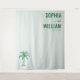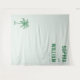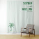 This wedding backdrop features a minimalist design with a soft mint green background, creating an elegant and serene atmosphere. The layout includes bold serif typography in deep forest green for the names "SOPHIA" and "WILLIAM," accompanied by a date below, all centered at the top. A detailed palm tree illustration adds a subtle tropical touch to the bottom left corner. The clean composition and modern aesthetic make it perfect for contemporary weddings, blending formality with relaxed charm.