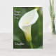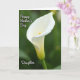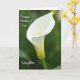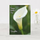 This card features a tall, vertical close-up of a single white flower, its smooth, trumpet-shaped bloom curving gently as if leaning in for a quiet moment ❤️. The petals glow in soft light, shifting from bright white at the top to a faint, pale green near the base, with a slim golden-orange center rising like a warm accent. Behind it, the background fades into a deep, blurred green that feels like a calm garden kept at a distance. The soft focus and diffused lighting give the flower a tender, intimate presence, like a gentle gesture between loved ones. In the upper left, the words “Happy Mother’s Day” appear in small white lettering, floating lightly against the darker green. In the lower left, “Daughter” is placed in matching white text, balancing the layout and adding a quiet family connection 🌼. The flower’s golden-orange center stands upright near the middle, framed by silky white petals and a subtle green base.