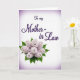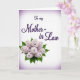 This card features a centered message reading “To my Mother-in Law” in deep plum-purple lettering, set against a soft white background that fades into a light lavender haze around the edges. The flowing letter shapes feel like a gentle embrace, adding a quiet closeness to the simple layout ❤️. Below the words, a full bouquet-like cluster of tiny blossoms spreads outward, suggesting a caring gesture shared between family members. The flowers are mostly creamy white with touches of blush pink, each petal shaded to look softly layered and slightly raised. Deep green leaves weave through the blooms, creating a fresh contrast that makes the pale colors feel even more tender. The text sits above the floral grouping with generous spacing, keeping the message easy to read while letting the flowers feel like they’re offering support beneath it 🌼. A faint lavender vignette frames the corners, and the bouquet rests along the lower center with leaves peeking to both sides.