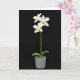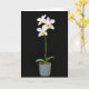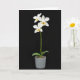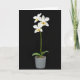 This card features a single delicate flowering plant centered against a deep black background, creating a dramatic stage that feels intimate and quiet ❤️. A slender green stem rises upward and holds three white blossoms, each one softly lit so the petals look almost translucent and gently curved. The flowers lean toward one another as if sharing a private moment, adding a subtle sense of closeness like a tender friendship. In the center of each bloom, warm golden yellow with touches of reddish-brown draws your eye and adds a softly romantic warmth to the cool whites. Near the bottom, broad deep-green leaves spread outward, giving the arrangement a grounded, protective feel. A short line of text sits near the top in small white lettering, with a second line placed lower in matching white to balance the layout 🌼. The plant rests in a simple cylindrical gray pot, and the dark soil texture is visible inside the rim.