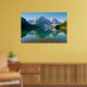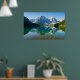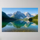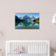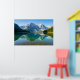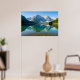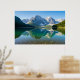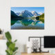 Capture the tranquility of nature with this stunning image of mountains reflected in a crystal clear lake. The green and blue waters reveal stones at the bottom, while rocky peaks and dense forests surround the scene. Intense sunlight creates a vibrant contrast between sky and earth. Ideal for room decor, calendars, and products celebrating the outdoors. A work that conveys peace, grandeur, and the untouched beauty of the natural landscape perfect for travel lovers.