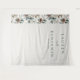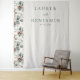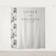 This elegant wedding backdrop features a vertical layout with a balanced composition, showcasing a repeating pattern of botanical illustrations on the left side. The design includes stylized leaves and pinecones in muted earthy tones of green and beige, creating a natural and organic feel. On the right side, ample negative space contrasts beautifully with the intricate pattern, while classic serif typography adds a touch of sophistication. Perfect for a serene and inviting wedding ceremony, this backdrop captures timeless refinement and celebrates the beauty of nature.