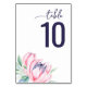 This wedding table card features a minimalist design with a clean white background, highlighting the text "table 10" in elegant cursive and bold sans-serif typography. The deep navy blue color contrasts beautifully against the backdrop, while a watercolor-style pink protea flower adds a touch of botanical elegance to the bottom left corner. The combination of modern minimalism and natural motifs creates a serene and inviting atmosphere, perfect for adding a sophisticated touch to your wedding reception seating arrangement.
