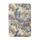 This artwork depicts an idyllic scene of traditional Asian pagodas nestled among vibrant trees and misty mountains. The color palette blends soft blues, rich oranges, and creams, giving the image a tranquil, dreamlike quality. Flowing waterfalls and delicate foliage add to the serenity, evoking a sense of harmony with nature.