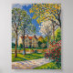 This vibrant wall art captures a serene park on a beautiful spring day. With trees blossoming in shades of green, yellow, and white, the scene is framed by a charming, elegant house in the background. People casually enjoy the day, strolling along sunlit paths or sitting on benches amidst blooming bushes of pink and red flowers. The clear blue sky adds a sense of warmth and calm, making this piece perfect for bringing a sense of relaxation and nature’s beauty into any room