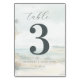 This wedding table card features a serene beach scene with soft watercolor textures, creating an impressionistic landscape of pastel blues, greens, and sandy beiges. The design includes a large numeral "3" in bold dark gray, complemented by elegant cursive and simple sans-serif typography for a sophisticated look. Palm trees and wispy clouds add to the tropical ambiance, while ample negative space ensures clarity and focus on the central elements. Perfect for weddings or formal gatherings, this card combines aesthetic appeal with functional elegance, setting a peaceful and inviting tone.