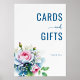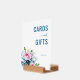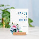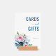 This wedding tabletop sign features a clean, minimalist layout with a soft pastel color palette of pink, blue, and green. The design includes a realistic floral illustration with a prominent light pink rose surrounded by white flowers and green leaves, creating an elegant and serene atmosphere. Bold serif typography highlights the words "CARDS and GIFTS," while a cursive script adds sophistication to the word "and." The overall mood is gentle and appreciative, making it perfect for expressing gratitude at your special event.