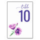 This elegant wedding table card features a minimalist design with a white background, showcasing the number "10" in bold, deep purple block letters. The layout includes delicate illustrations of pink and lavender poppies with green foliage, adding a touch of botanical charm. The cursive script above the number enhances the sophisticated yet serene mood, making it perfect for creating an inviting atmosphere at your special event.
