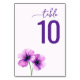 This wedding table card features a minimalist design with a clean white background, showcasing the number "10" in bold, deep purple font. The word "table" is elegantly written in cursive above the numeral, while two beautifully illustrated flowers with pink and purple petals add a touch of natural charm to the bottom left corner. The overall style is contemporary and sophisticated, perfect for creating an inviting and refined atmosphere at your special event.
