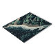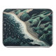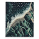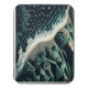 Serene Shores: This stunning top-down illustration captures the harmony of land and sea, featuring waves gently breaking on sandy beaches with lush green mountains in the background. Rendered in soothing shades of dark blue-green, the artwork evokes a sense of tranquility and balance. The intricate detail of the ocean’s patterns meeting the shore, paired with the trees lining the water’s edge, enhances the peaceful atmosphere. Created in a woodcut print style with simple lines and a flat design, the piece is reminiscent of hand-drawn animation, offering a timeless, serene depiction of nature’s beauty.