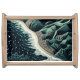 Serene Shores: This stunning top-down illustration captures the harmony of land and sea, featuring waves gently breaking on sandy beaches with lush green mountains in the background. Rendered in soothing shades of dark blue-green, the artwork evokes a sense of tranquility and balance. The intricate detail of the ocean’s patterns meeting the shore, paired with the trees lining the water’s edge, enhances the peaceful atmosphere. Created in a woodcut print style with simple lines and a flat design, the piece is reminiscent of hand-drawn animation, offering a timeless, serene depiction of nature’s beauty.