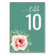 This wedding table card features a serene teal background with the text "table 10" elegantly displayed in contrasting cursive and bold fonts. A beautifully illustrated pink rose, accompanied by delicate baby's breath flowers and green leaves, adds a touch of natural charm to the minimalist design. The botanical theme creates an inviting and refined atmosphere, perfect for enhancing your wedding decor with a harmonious blend of nature and modern aesthetics.