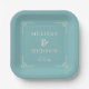 This elegant wedding plate features a minimalist design with a calming teal background, accented by clean lines and geometric corner motifs. The layout centers on sophisticated typography in a serif font, creating a harmonious balance that exudes modern elegance with vintage charm. Perfect for formal occasions, the serene color palette and structured composition make it an ideal choice for celebrating love and unity at your special event.