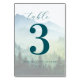 This wedding table card features a serene nature-inspired design with misty mountains and evergreen trees in soft pastel greens and blues, creating a tranquil atmosphere. The layout is balanced and centered, showcasing a bold teal numeral "3" and elegant cursive typography for the word "table." Customizable elements allow for personalization with names and dates, making it perfect for weddings or formal gatherings. The abstract yet recognizable landscape evokes feelings of calmness and romance, ideal for setting an inviting and harmonious mood at your special event.