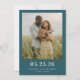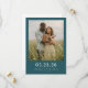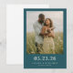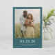 This wedding save the date features a serene and romantic design with a central photograph of two individuals standing in a field surrounded by tall grass and wildflowers. The layout is vertically oriented, with ample negative space that highlights the natural beauty and intimacy of the moment. A solid teal frame borders the top and bottom, adding a cool contrast to the warm tones of the scene, while clean, modern sans-serif typography provides a contemporary touch for customizable details. The overall mood is tranquil and joyful, capturing an authentic connection between the subjects, making it perfect for couples looking to celebrate their love story.