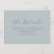 This wedding enclosure card features a minimalist design with a soft, muted teal background that exudes elegance and serenity. The layout is centered, showcasing the phrase "The Details" in an elegant cursive script font, followed by straightforward serif text guiding guests to visit a customizable website for more information. The generous spacing and balanced typography create a modern, understated look perfect for conveying essential details with clarity and style. Ideal for weddings, this card sets a calm and inviting tone, making it a sophisticated addition to any bridal suite.