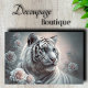 Elevate your DIY crafts with Decoupage_Boutique's premium white tiger decoupage paper. This serene design features a majestic white tiger with striking blue eyes and gentle expression surrounded by delicate blush roses and soft foliage against a luminous misty background. This design creates an elegant focal point perfect for personal retreats, holistic spaces, or ethereally-inspired spaces. COLOR COMBINATIONS: pearl white, blush pink, ice blue, silver gray, and mint green enhance natural beauty. DESIGN FEATURES: luminous diffused lighting, exceptional fur detail, and harmonious floral composition bring depth to your projects. PERFECT FOR: keepsake boxes, vanity accessories, room dividers, luxury spas, meditation centers, and tranquil home accents. Ideal for a variety of projects both large and small.