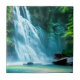 Ceramic tile in an illustration of a cascading waterfall in pale blue with white spray, surrounded by boulders and green leaves