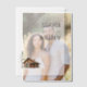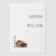 This elegant wedding invitation features a minimalist layout with ample negative space, creating a clean and sophisticated look. The design includes a watercolor illustration of a rustic log cabin beside an evergreen tree, adding a touch of nature to the neutral palette of whites, grays, and earthy tones. Serif fonts in varying weights provide a classic feel, emphasizing the names while maintaining readability for all details. Perfect for couples seeking a serene and inviting atmosphere, this template is customizable, allowing you to personalize it for your special day.