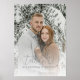 This wedding table card features a serene winter theme with two individuals standing closely in front of snow-covered trees, creating an intimate and festive atmosphere. The design uses a soft color palette of whites, grays, and muted earth tones to enhance the wintry feel, while the elegant cursive script for "table 12" adds a touch of sophistication. The realistic photographic style captures natural textures and lighting, making it perfect for weddings or formal gatherings that celebrate love amidst a tranquil snowy landscape.
