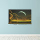 Digital illustration of an alien world with a moon setting over a lake.