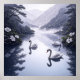 This soft-toned landscape depicts a tranquil lake surrounded by misty mountains and forests, with swans gliding gracefully. The calm water reflections and delicate flowers create a scene of peace and natural beauty, a serene retreat in untouched nature.
