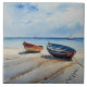 "Serenity Shores". A tranquil seascape, where azure waters meet the gentle kiss of golden sands. Rowboats rest peacefully, adding to the serene charm. A stylized watercolour in gentle blues and hues of fine sand.