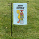 Flag bracket is super easy to assemble. There is a prong fork that goes into the ground. I dug a shallow hole to bury the prongs and still had enough height. Reinforced stitching on for the flag opening. Colors are true to the website. Mona Lisa's sign with the text is easy to read, the text is clear and not blurry.