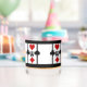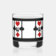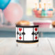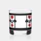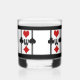 Perfect for drinks on Poker Night or your next Card Party, these personalized whiskey glasses feature an Art Deco inspired original design w/ a card playing theme composed of 4 sets of bright red & black card suit symbols (diamond, clover, heart & spade) w/a custom text field for your monogram in the center, set on a snow white background w/ black thick & thin vertical stripes & thick top & bottom borders.