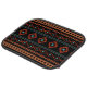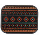 Aztec influenced pattern in symbols/motifs of rust colors and light teal on a black background design.