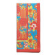 A set of four colorful cloth Dinner or Cocktail Napkins, with a patchwork pattern of red, orange and yellow flowers on a bright turquoise background, from a handpainted paper collage by Judy Adamson, teamed with white polka dots on a red background and red, orange and yellow stripes.