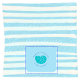 Set tre asciugamani bagno,fondo celeste con disegno righe e logo appartamento per vacanze.