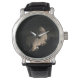 This men's watch features a setting moon on the face with black leather wrist strap and silver back.